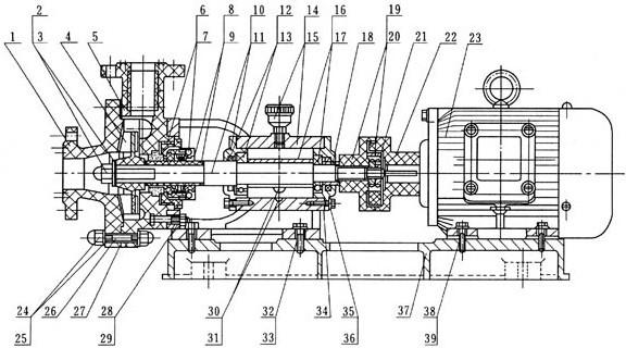 6、如果更換滾珠軸承或泵軸時(shí),必須折下機(jī)架,松開(kāi)前端軸承蓋4只螺釘,折下泵軸后端園螺母和聯(lián)軸節(jié),將泵軸向前端方向打出即可,再后折下后端軸封蓋。